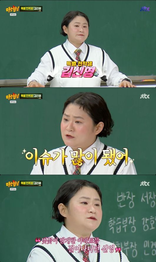 강호동의 소개로 교실에 등장한 김신영은 “나는 전학생이다. 지난 번에 ‘아는 형님’ 나가고 나서 이슈가 많이 됐다”라고 자신을 소개했다. 강호동은 “고급스럽게 레전드 찍었다”라고 말했다.