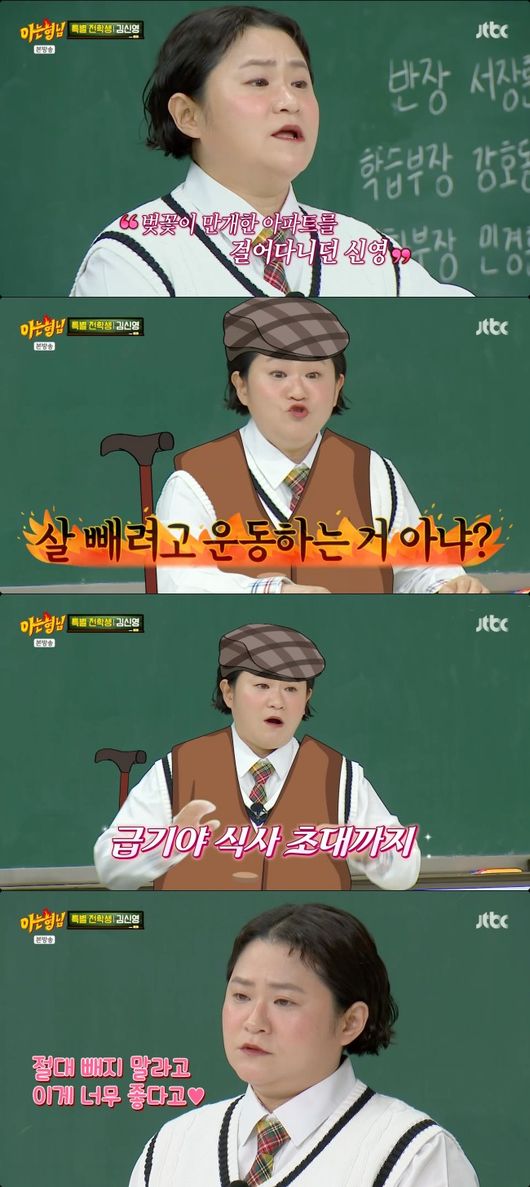 이에 김신영은 “얼마나 레전드였나면, 얼마 전에 벚꽃이 피어서 예뻐서 아파트를 걸어다니고 있었다”라며, “어떤 어르신이 갑자기 ‘김신영 씨, 살 빼려고 운동하는 거 아니냐고 하더라. 빼지 말라고 우리 집에서 밥 먹고 가라고 하셨다. 절대 빼지 말라고”라고 일화를 공개했다.