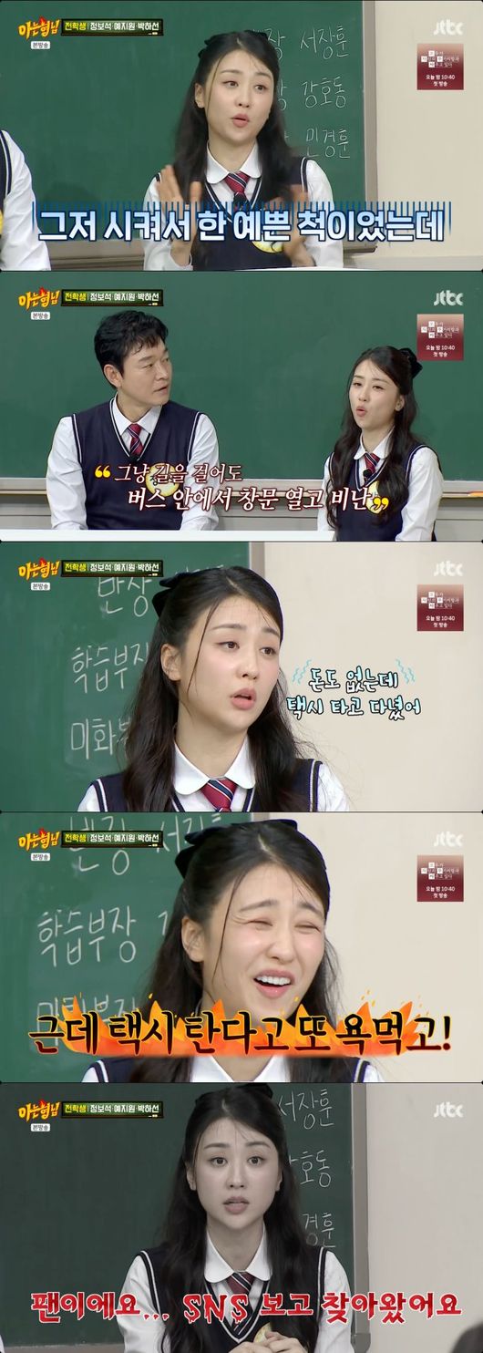 박하선은 “예쁜 척 따라했는데 뭐 재수 없나 없었나 보다. 나도 시켜서 한 건데.. 돈도 없는데 택시 타고 다녔다. 그런데 택시 탄다고 또 욕 먹었다”라고 덧붙였다.