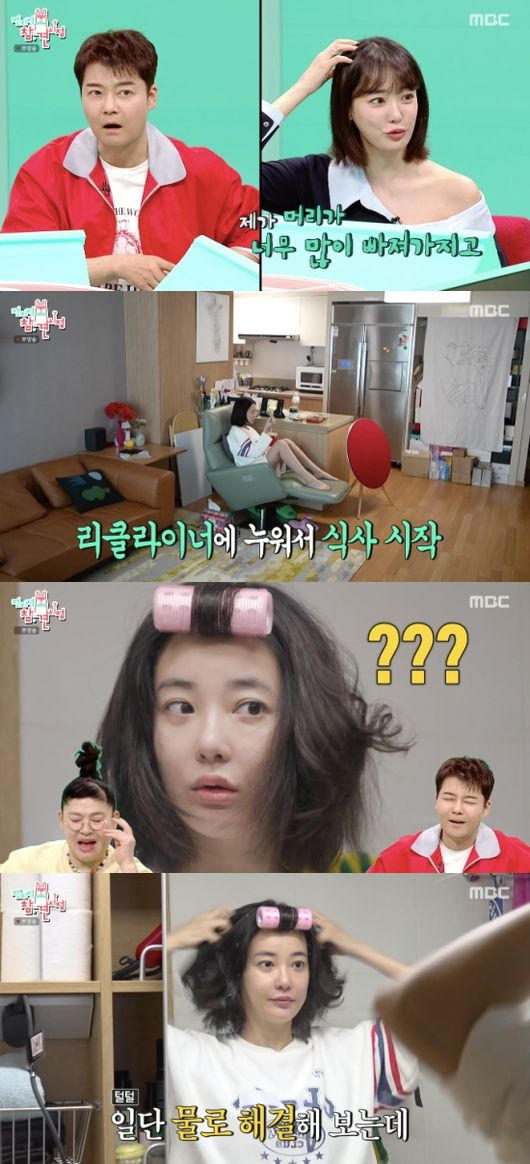 이주연은 부기를 빼기 위해 얼음 마스크팩을 꺼내 착용했다. 벽, 의자를 잡고 스트레칭을 하기도. 이주연은 주방으로 향했다. 약통이 보이자 이주연은 탈모 관리약을 복용한다며 “머리가 요즘에 너무 빠진다”라고 설명했다.