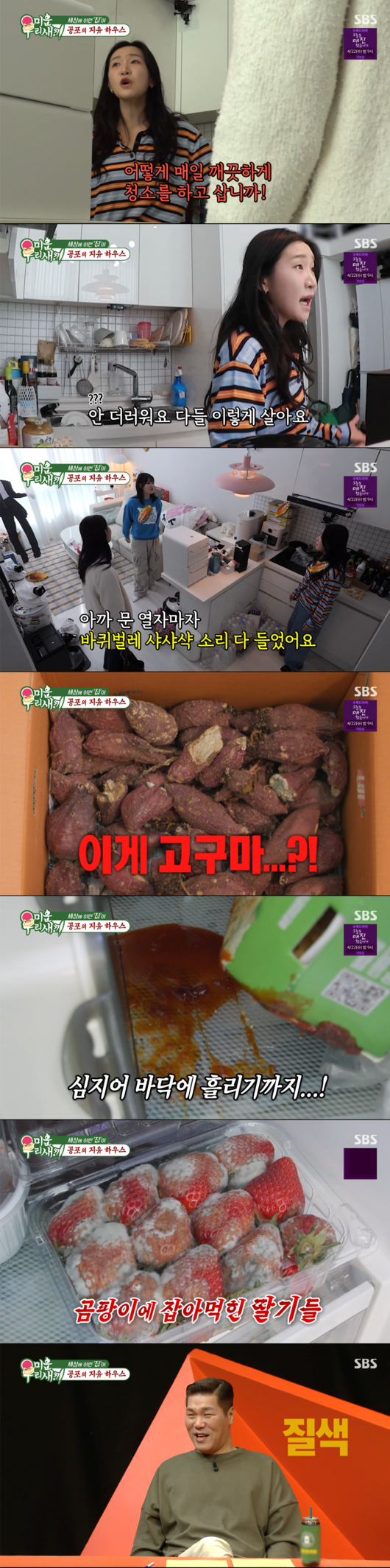 본격적인 점검에 나선 한혜진은 밥통이 바닥에 놓여 있는 것부터 지적하며 "집이 참 재밌다"고 혀를 내둘렀다. 특히 냉장고에서 곰팡이에 완전히 잡아먹힌 딸기가 발견되자, 스튜디오의 서장훈은 참지 못하고 오만상을 찌푸리며 질색하는 표정을 지어 웃음의 정점을 찍었다.