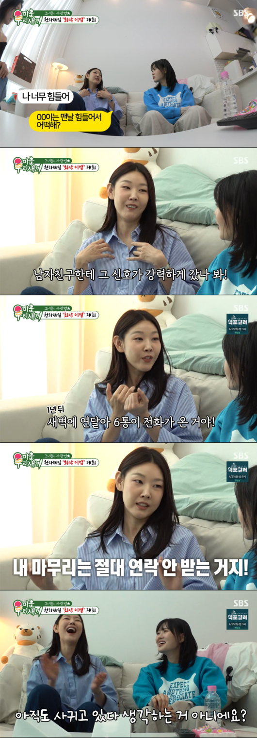 최악의 이별에 대해 이야기를 나누던 중 한혜진은 과거 남자친구와의 일화를 회상했다. 당시 남자친구가 자꾸만 힘들다고 하기에 한혜진은 “맨날 힘들어서 어떡해”라고 톡을 보냈다고 밝혔다.