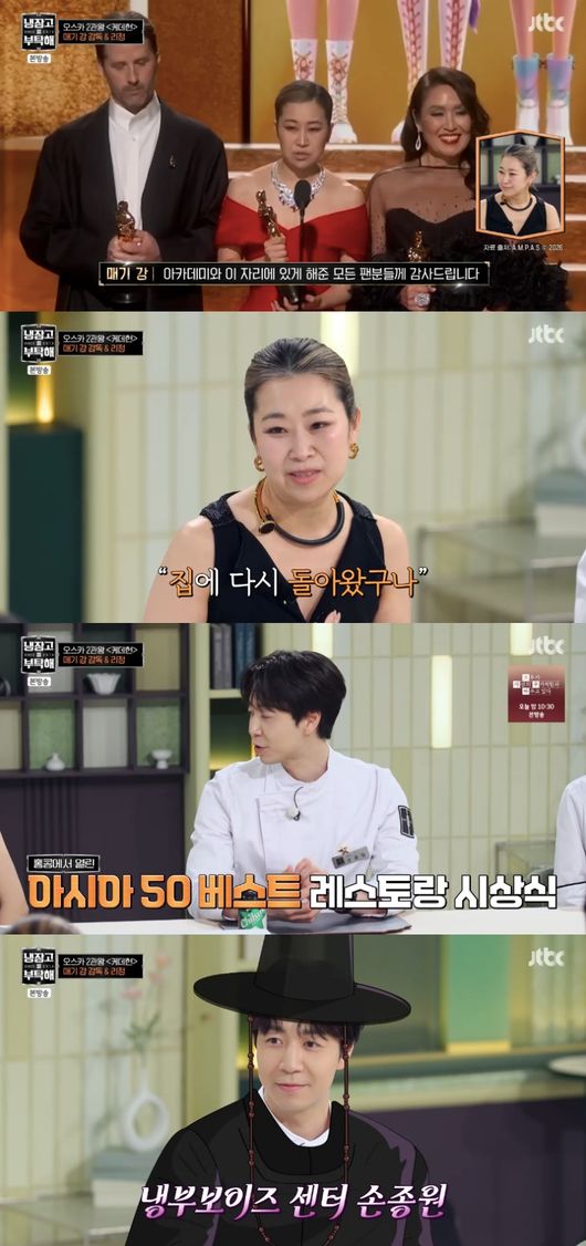 김성주는 “오스카에서 ‘코리아’가 딱 나왔을 때 감동이었는데 현장에서 어땠나”라고 물었다. 매기 강은 “저는 한국에 태어났다. 한국에 올 때마다 나는 집에 다시 돌아왔다 느꼈다. 한국인으로서 자부심으로 한국 문화를 담긴 영화를 만들고 싶었다”라고 밝혔다.