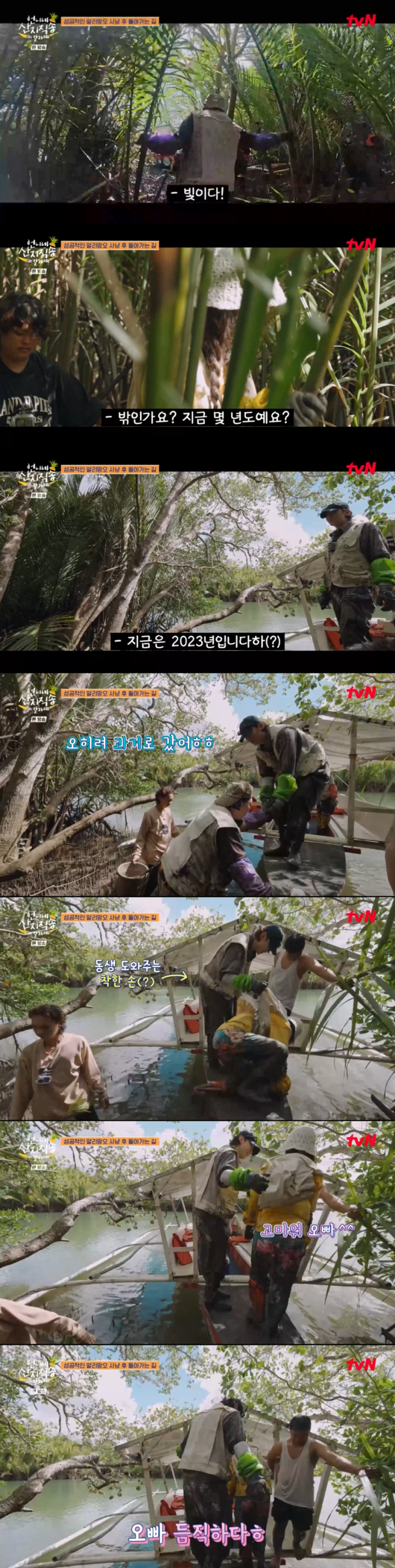 멤버들은 험난했던 알리망오 사냥을 마치고 복귀길에 올랐다. 빽빽한 풀숲과 발이 푹푹 빠지는 진흙 늪을 헤치며 나아가던 중, 김혜윤은 멀리 밖이 보이기 시작하자 “밖이 보이는 것 같아. 난 살았다. 드라마 하나 찍어야겠다”고 외치며 특유의 엉뚱한 매력을 발산했다.