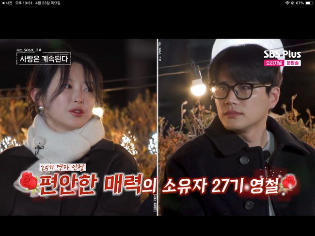 23일 방영한 ENA, SBS Plus 예능 ‘나는 SOLO, 그 후 사랑은 계속된다’(이하 ‘나솔사계’)에서는 25기 영자와 함께 18기 영호, 13기 상철, 15기 영철, 27기 영철이 다대일 데이트를 즐겼다. 이 과정에서 15기 영철과 13기 상철은 마음이 확고해졌지만 25기 영자는 예기치 못한 두 사람의 등장에 놀라움을 감추지 못했다.