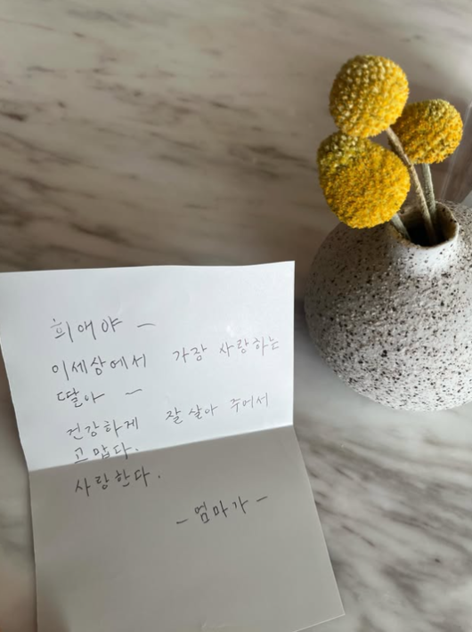 공개된 사진 속에는 김희애가 모친에게 받은 손편지를 찍은 모습이 담겨 있다. 1967년 생으로, 4월 23일에 태어난 김희애는 이틀 전 59번째 생일은 맞았다. 앞서 생일날, 큰 꽃다발과 다양한 선물을 인증한 가운데, 다음날에는 엄마가 준 편지 선보였다. 손편지 안에는 "희애야 이 세상에서 가장 사랑하는 딸아, 건강하게 잘 살아 주어서 고맙다. 사랑한다. -엄마가-"라고 적혀 있어 보는 이들까지 감동하게 만들었다.