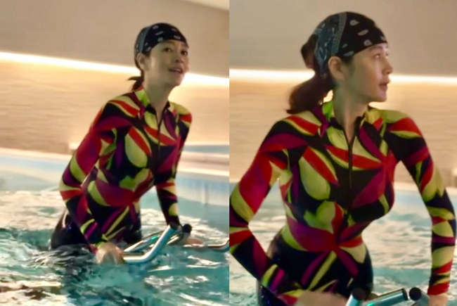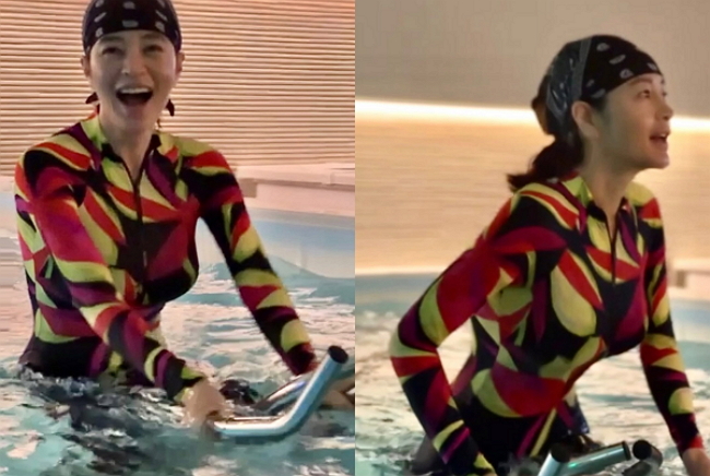 김혜수는 25일 자신의 개인 채널에 별다른 문구 없이 여러 장의 사진을 게재했다. 공개된 사진 속 김혜수는 실내에서 수중 운동에 열중하고 있는 모습이다. 특히 화려한 색감과 기하학적인 패턴이 돋보이는 타이트한 전신 수영복에 두건까지 착용해 눈길을 끌었다.