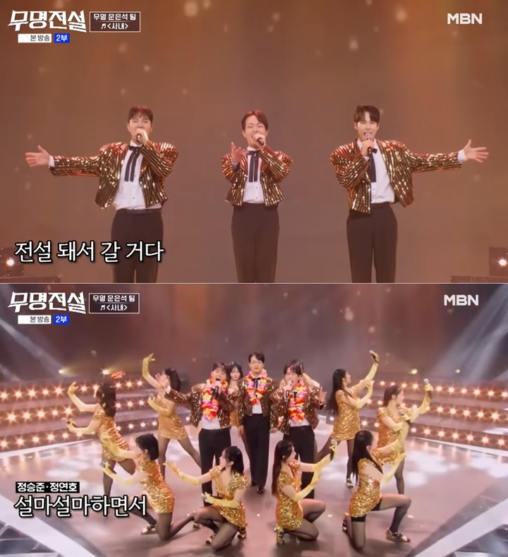 이들은 '사내'를 선곡해 3명의 보컬을 중심으로 무대를 구성하는 동시에 여성 댄서들의 코러스를 더해 자칫 빈약해 보일 수 있는 무대를 한층 풍성하게 채워냈다. 경연 무대에서 처음 시도하는 연출적 구성에도 불구하고 세 사람의 보컬 시너지는 안정적으로 어우러졌고, '무명 가수' 세 사람이 무대를 통해 반드시 결과를 만들어내겠다는 도전 의지 역시 더욱 선명하게 드러났다.