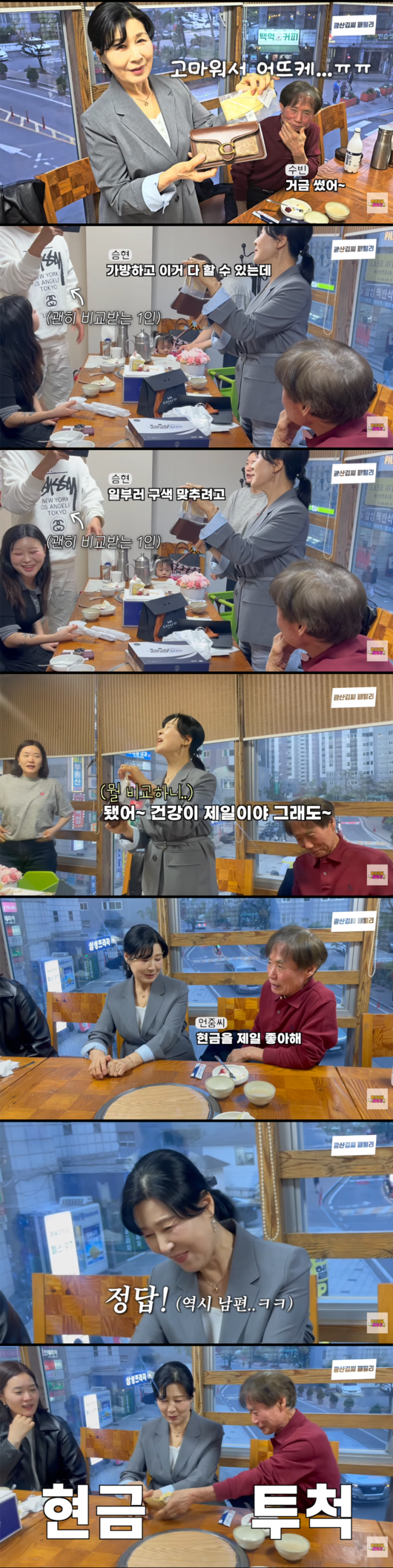 이어 남편 언중 씨는 “옥자 씨가 현금을 제일 좋아해”라며 현금 뭉치를 터프하게 투척해 가족들의 뜨거운 환호를 받았다. 백옥자 여사는 현금을 받자마자 그 자리에서 즉시 돈을 세어보는 현실적인 반응을 보여 마지막까지 큰 웃음을 안겼다.