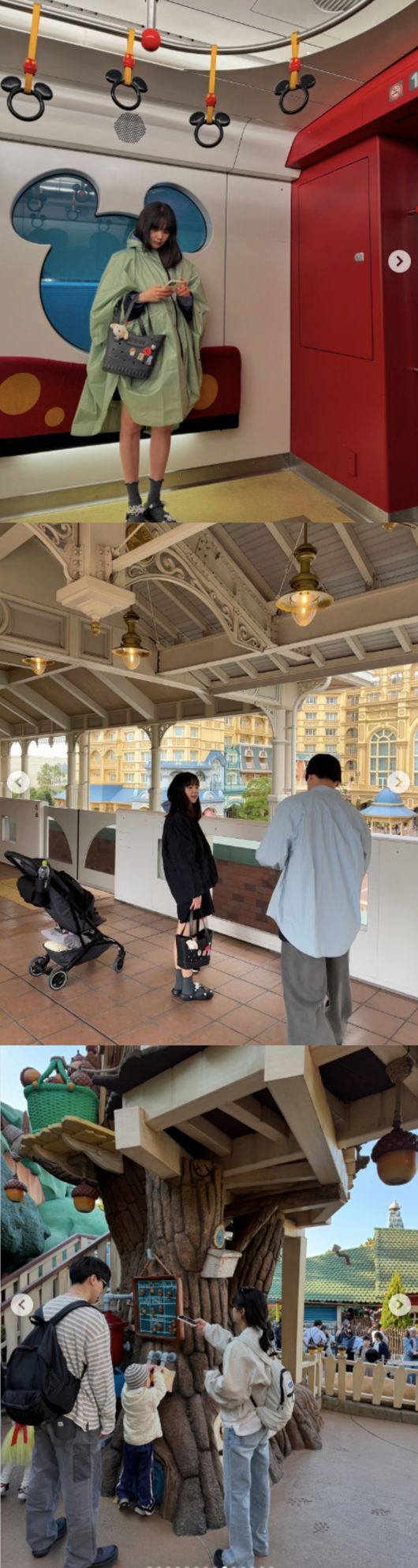 사진 속 윤승아는 가족과 함께 일본 도쿄 디즈니랜드와 디즈니씨를 찾았다. 디즈니랜드 열차에 탑승한 그는 김무열, 아들과 함께 나란히 앉아 셀카를 찍어 훈훈함을 자아냈다.