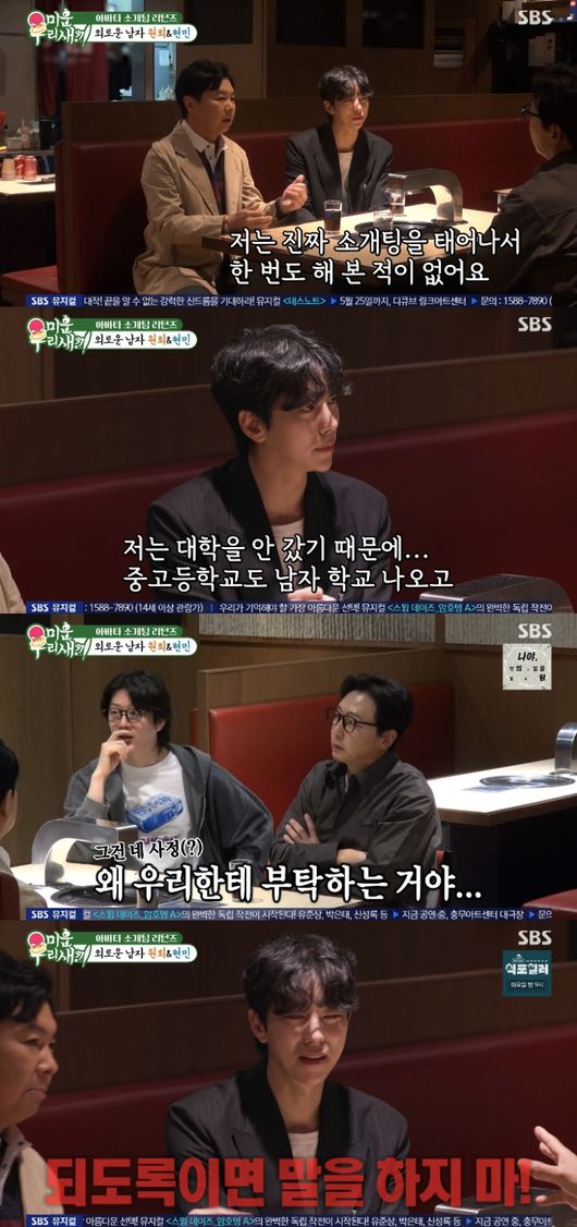 탁재훈은 “현민이 너는 왜 갑자기 소개팅 나왔냐”라고 물었다. 윤현민은 “저는 진짜 소개팅을 태어나서 한 번도 해 본 적이 없다. 저는 대학을 안 갔기 때문에 중, 고등학교도 남자 학교고”라고 토로했다.