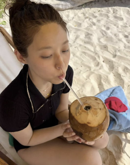 또 다른 사진에서는 코코넛 음료를 마시며 휴식을 즐기는 모습도 담겼다. 화장기 거의 없는 수수한 얼굴에도 또렷한 이목구비와 맑은 피부가 돋보이며 ‘꾸안꾸’ 매력을 완성했다.