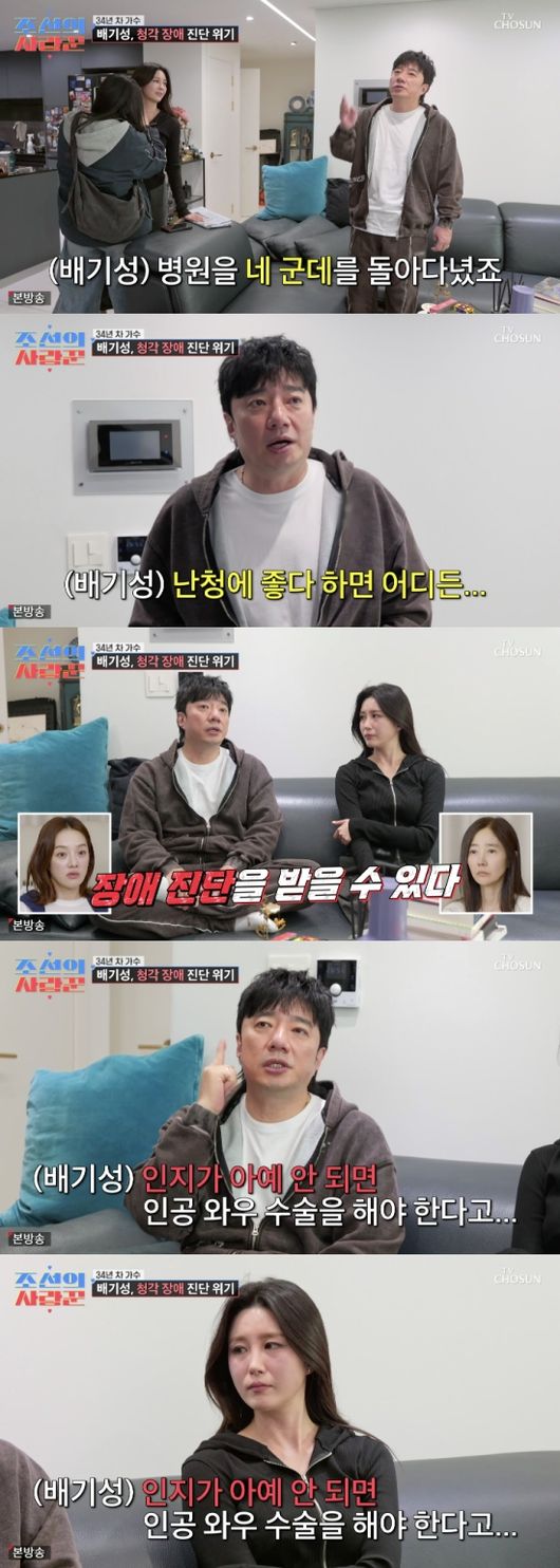 배기성은 난청을 겪은 지 세 달째라고 말하며 “6개월까지 안 들리면 장애 진단을 받을 수 있다고 하더라. 진단을 받으면 인공 와우 수술을 하거나 보청기를 해야 한다더라. 소리가 들리면 보청기를 할 수 있는데 소리가 인지가 아예 안 되면 인공 와우 수술을 해야 한다고 하더라. 적응 기간이 1년 정도 된다고 하더라”라고 어두운 얼굴로 설명했다.