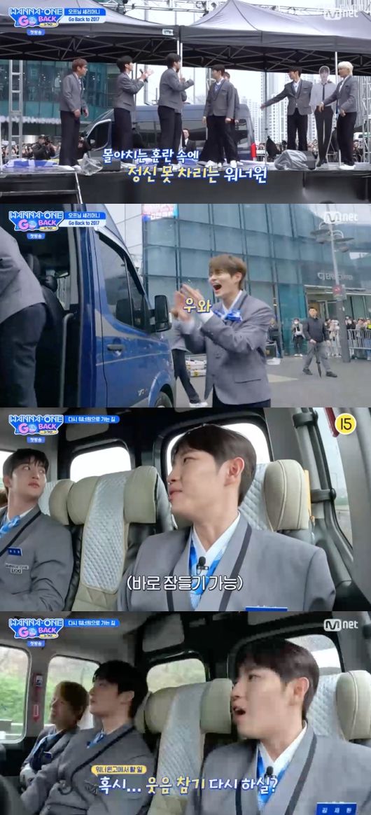 워너원 앞에 나타난 것은 익숙한 차, 그리고 워너원 전담 매니저와 경호원. 이에 멤버들은 깜짝 놀라 말을 잇지 못했다. 멤버들은 차에 탔고 황민현은 “그때는 차에서 다 기절했다”라고 과거를 회상했다.