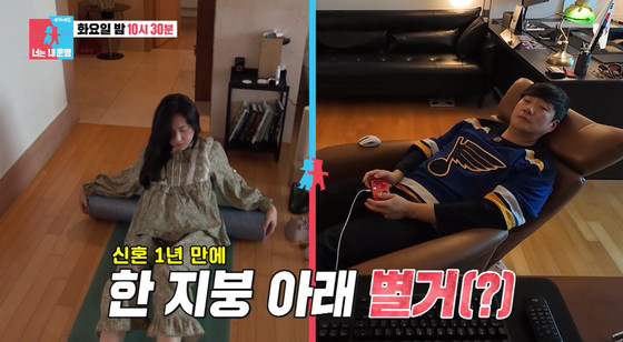 하지만 달콤한 분위기도 잠시, 제작진은 '신혼 1년 만에 한 지붕 아래 별거'라는 자막과 함께 반전 상황을 제시했다. 두 사람은 이내 각자의 공간으로 흩어져 배성재는 홀로 게임에 몰두하고, 김다영은 거실에서 운동과 차를 즐기는 등 철저히 분리된 생활 방식을 보여주어 의아함을 자아냈다.