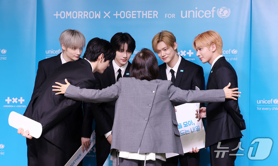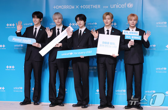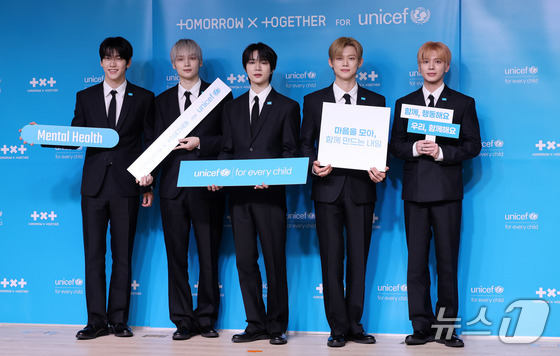 그룹 투모로우바이투게더(수빈,연준,범규,태현,휴닝카이)가 29일 오전 서울 마포구 유니세프 한국위원회에서 열린 전 세계 아동·청소년의 마음건강을 위한 글로벌 캠페인 '투게더 포 투모로우'(TOGETHER FOR TOMORROW) 론칭 기자간담회에 참석했다.
