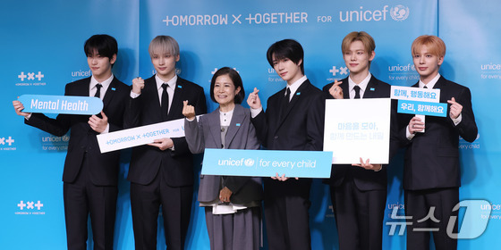 조미진 유니세프 한국위원회 사무총장과 투모로우바이투게더(TXT)가 29일 서울 마포구 유니세프 한국위원회 블루홀에서 열린 전 세계 아동·청소년 마음건강 지원 '투게더 포 투모로우' 유니세프 캠페인 론칭 기자간담회에 참석해 포즈를 취하고 있다. 2026.4.29 © 뉴스1 박지혜 기자