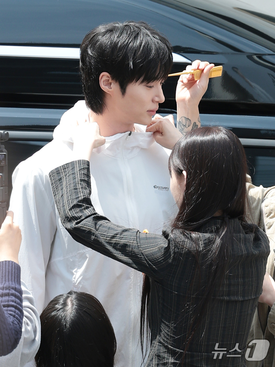 배우 변우석이 29일 서울 성동구 쎈느에서 열린 아웃도어 브랜드 디스커버리 익스페이션의 여름 시즌 브랜드 체험 행사 'DISCOVER YOUR ACTIVE SUMMER'에 참석하기 전 메이크업을 고치고 있다. © 뉴스1 권현진 기자