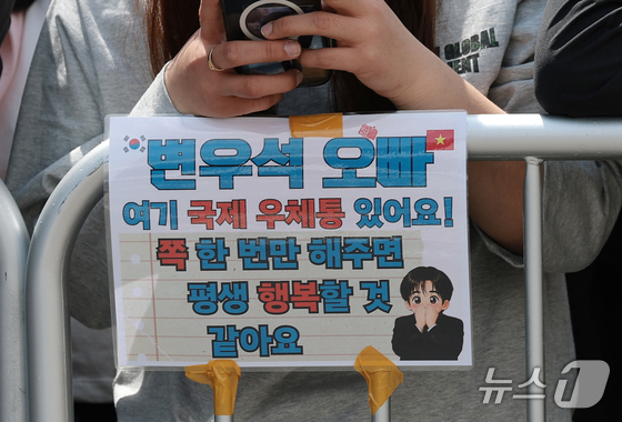 29일 서울 성동구 쎈느 인근에서 아웃도어 브랜드 디스커버리 익스페이션의 여름 시즌 브랜드 체험 행사에 참석하는 배우 변우석을 보기위해 한 해외 팬이 변우석을 기다리고 있다. © 뉴스1 권현진 기자