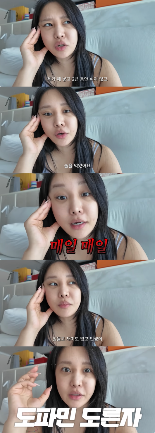 랄랄은 “항상 불안하고 시끄럽고 도파민이 떨어져가지고 맨날 술에 의지하고. 제가 애 낳고 2년 동안 쉬지 않고 술을 먹었어요. 매일매일. 안 그러면 버틸 수가 없고. 힘들고 재미도 없고. 술을 마시면 도파민이 나오잖아요. 맨날 술에 의존했던 거예요”라고 말했다.