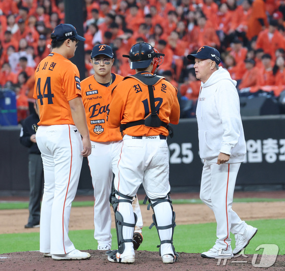 18일 대전 한화생명볼파크 열린 프로야구 2025 신한 SOL뱅크 KBO 플레이오프 1차전 삼성 라이온즈와 한화 이글스의 경기에서 9회 한화 김서현이 실점하며 흔들리자 김경문 감독이 마운드에 오르고 있다. 2025.10.18/뉴스1 © News1 김기남 기자