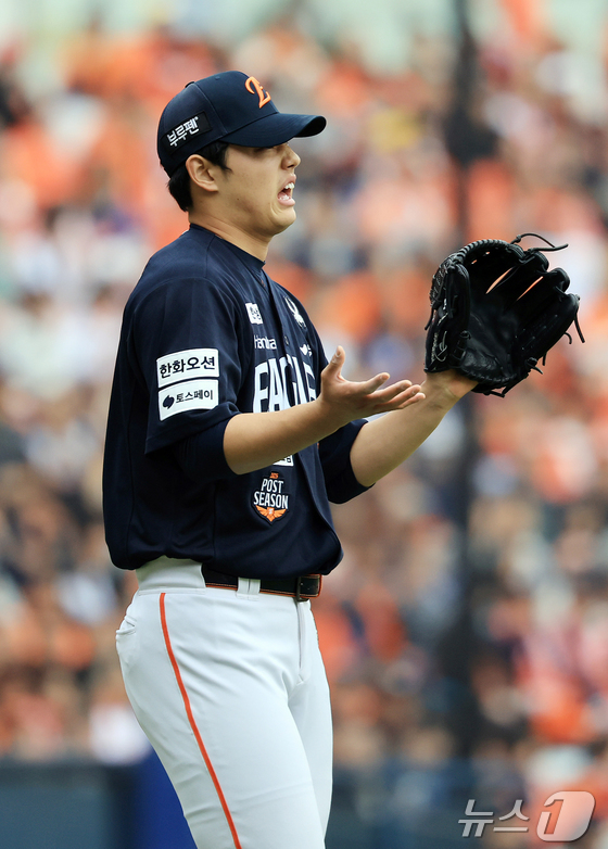 26일 서울 잠실야구장에서 열린 프로야구 2025 신한 SOL뱅크 KBO 포스트시즌 한국시리즈 1차전 한화 이글스와 LG 트윈스의 경기, 한화 선발 문동주가 1회말 무사 1루 상황 LG 신민재에게 내야안타를 허용한 뒤 아쉬워하고 있다. 2025.10.26/뉴스1 © News1 김진환 기자