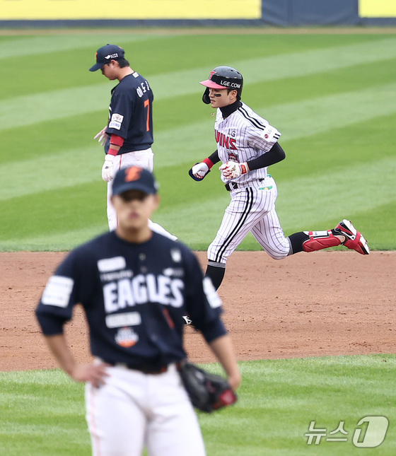 26일 서울 잠실야구장에서 열린 프로야구 2025 신한 SOL뱅크 KBO 포스트시즌 한국시리즈 1차전 한화 이글스와 LG 트윈스의 경기, LG 박해민이 6회말 무사 선두타자로 나서 솔로홈런을 터뜨린 후 그라운드를 돌고 있다. 2025.10.26/뉴스1 © News1 김성진 기자