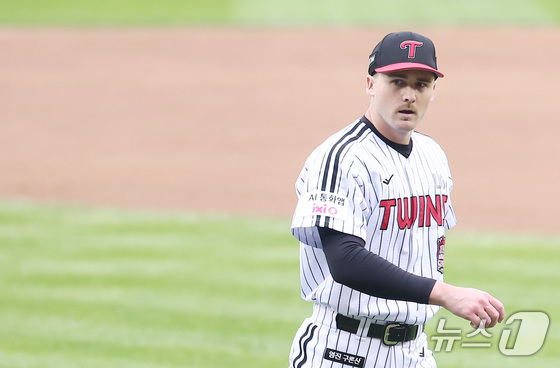 26일 서울 잠실야구장에서 열린 프로야구 2025 신한 SOL뱅크 KBO 포스트시즌 한국시리즈 1차전 한화 이글스와 LG 트윈스의 경기, LG 선발 톨허스트가 5회초 2사 3루 한화 손아섭을 헛스윙 삼진으로 아웃시킨 후 더그아웃으로 향하고 있다. 2025.10.26/뉴스1 © News1 김성진 기자