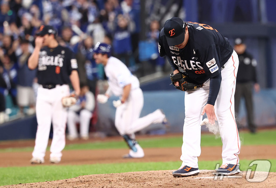 플레이오프 3차전에서 삼성 라이온즈 김영웅에게 3점 홈런을 허용한 뒤 아쉬워하는 한화 이글스 투수 류현진. 2025.10.21/뉴스1 © News1 김성진 기자