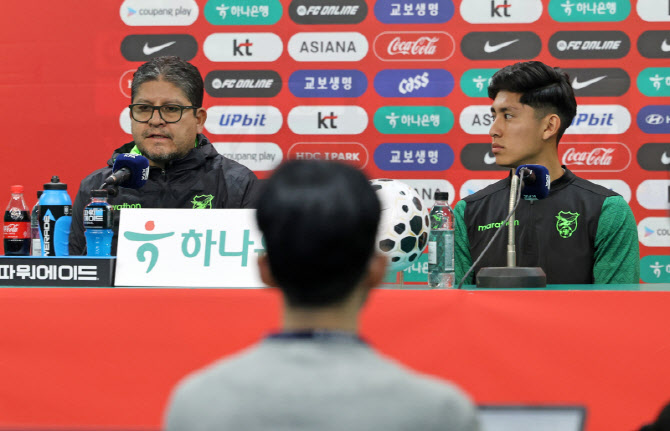 볼리비아 남자 축구대표팀 오스카르 비예가스 감독(왼쪽)과 미구엘 테르세로스가 13일 오후 대전월드컵경기장에서 A매치를 앞둔 기자회견을 하고 있다. 사진=연합뉴스