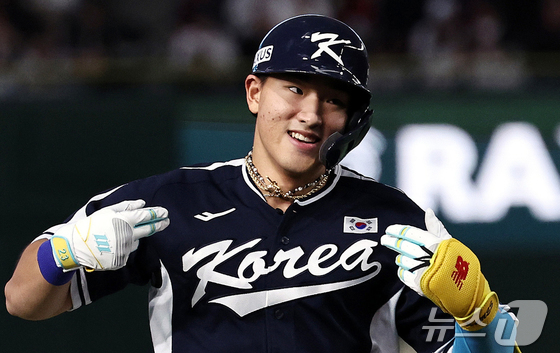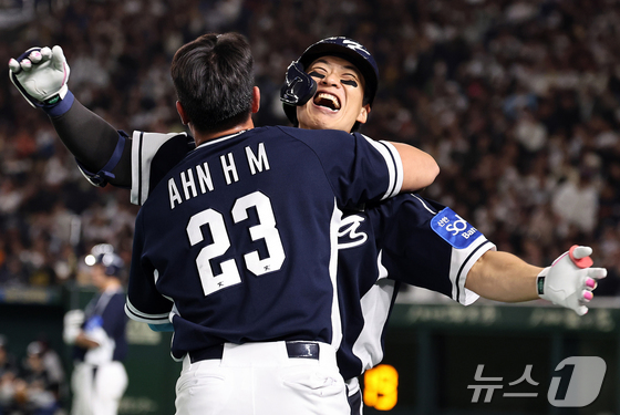 15일 오후 일본 도쿄돔에서 열린 월드베이스볼클래식(WBC) 대비 평가전 '2025 케이 베이스볼 시리즈(K-BASEBALL SERIES)' 일본과의 1차전 경기. 대한민국 송성문이 4회초 무사 주자 없는 상황, 백투백 홈런를 때린 뒤 안현민과 기쁨을 나누고 있다. 2025.11.15/뉴스1 © News1 구윤성 기자