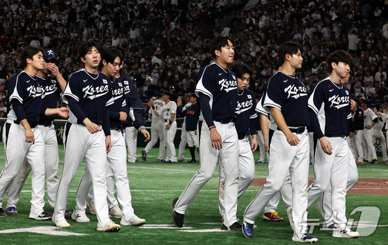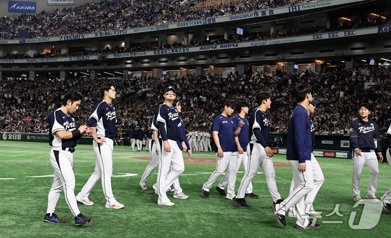 류지현 감독이 이끄는 야구 국가대표 선수들이 15일 오후 일본 도쿄돔에서 열린 월드베이스볼클래식(WBC) 대비 평가전 '2025 케이 베이스볼 시리즈(K-BASEBALL SERIES)' 일본과의 1차전 경기에서 일본에 11대 4로 역전패한 뒤 경기장을 빠져나가고 있다. 2025.11.15/뉴스1 © News1 구윤성 기자