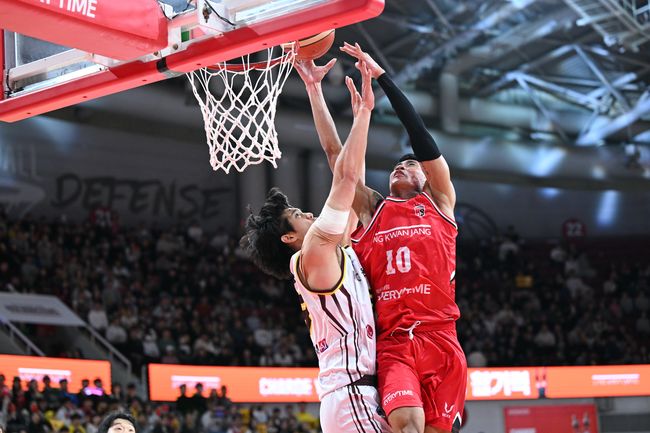 선두싸움이 걸린 빅매치였다. 정관장은 전반전까지 40-30으로 앞서며 유리한 위치를 잡았다. 하지만 3쿼터부터 LG의 대반격이 시작됐다. 정관장이 3쿼터에만 6개의 턴오버를 범하며 14점에 그쳤다. 공격력이 살아난 LG가 28점을 퍼부었다. 최형찬이 3쿼터에만 3점슛 3개 포함 11점을 몰아쳤다. LG가 58-54로 역전했다.