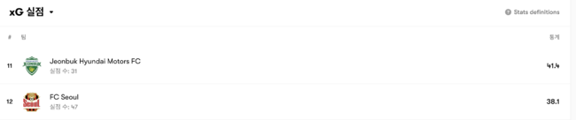 수비에서는 xGC 기대실점이 있다. 경기 중 얼마나 위험한 장면을 허용했는가를 보여주는 수치다. 서울은 기대실점이 38.1로 리그에서 가장 낮았다. 즉 상대에게 좋은 기회를 가장 적게 준 팀이다. 단순히 수비라인을 내리고 버틴 게 아니라 능동적인 차단과 압박으로 위험 상황을 원천 봉쇄했다는 의미다.