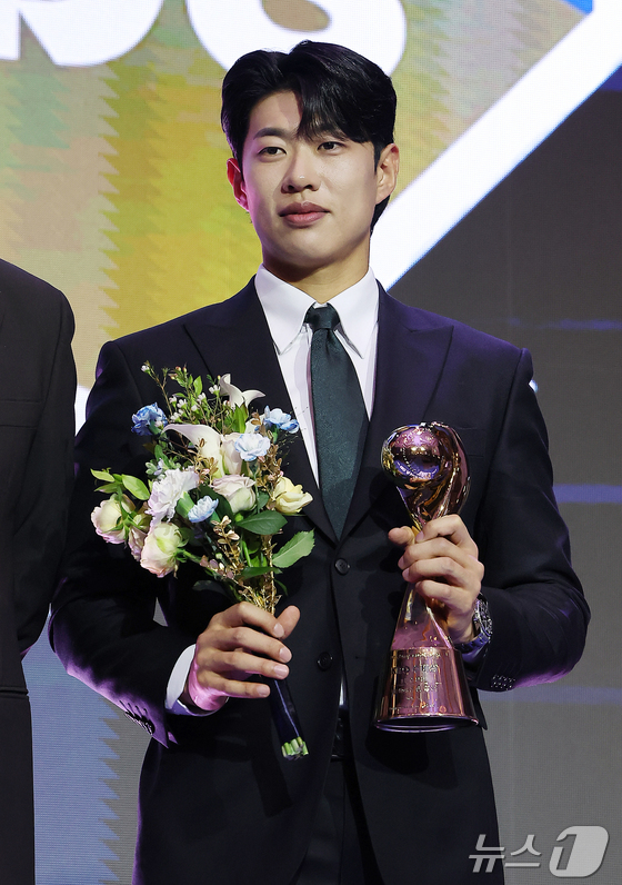 24일 오후 서울 송파구 잠실 롯데월드 호텔에서 열린 프로야구 '2025 신한 SOL 뱅크 KBO리그' 시상식에서 3루수 부문 수비상을 수상한 키움 송성문이 기념 촬영을 하고 있다. 2025.11.24/뉴스1 © News1 김진환 기자