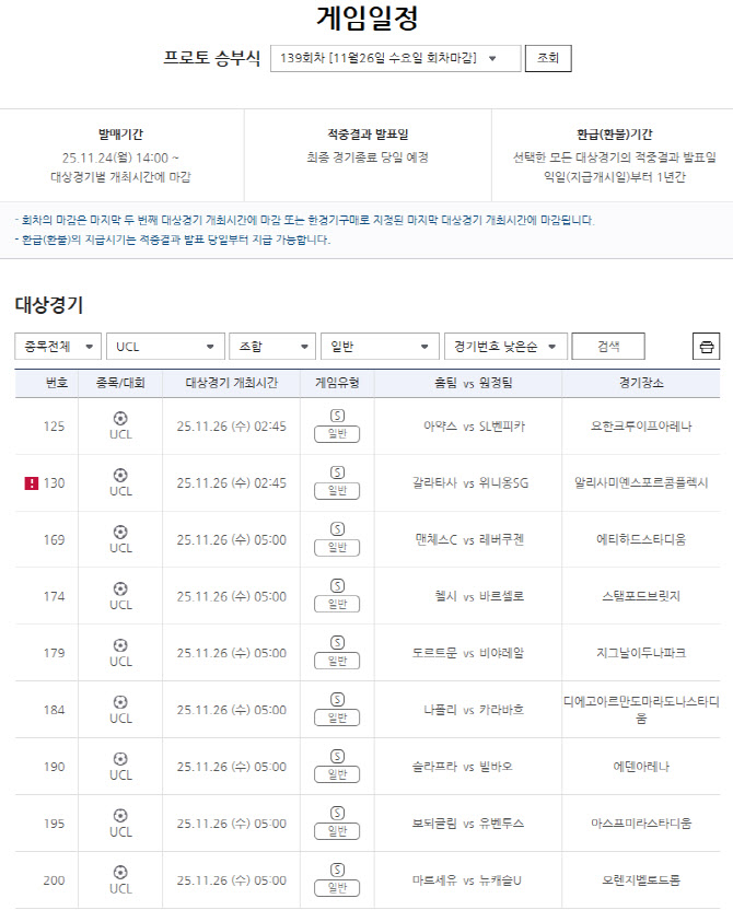 한편, 2025·2026 유럽축구연맹(UEFA) 챔피언스리그(UCL) 리그페이즈 경기들을 대상으로 하는 프로토 승부식 139회차의 자세한 경기 분석 내용 등은 공식 온라인 발매사이트 베트맨 내 토토가이드 페이지에서 확인할 수 있다.
