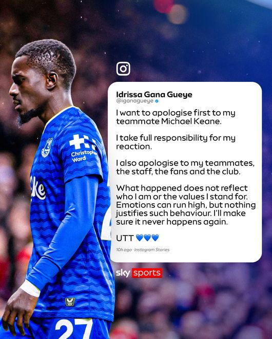 영국 '풋볼 인사이더'는 25일(이하 한국시간) "게예가 마이클 킨을 때린 뒤 에버튼 팀원들을 향한 메시지를 게시했다. 그는 에버튼이 맨체스터 유나이티드를 상대로 승리한 경기에서 퇴장당한 뒤 공개 사과문을 발표했다"라고 보도했다.