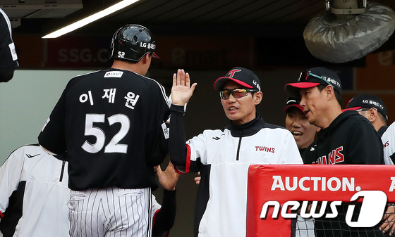 하이파이브 하는 이재원(왼쪽)과 염경엽 LG 트윈스 감독. 뉴스1 DB © News1 박지혜 기자
