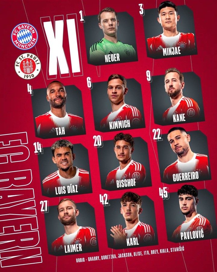 이날 뮌헨은 해리 케인을 필두로 루이스 디아스, 라파엘 게레이로, 레나르트 칼, 알렉산다르 파블로비치, 조슈아 키미히, 톰 비쇼프, 조나단 타, 김민재, 콘라트 라이머, 골키퍼 마누엘 노이어가 선발 출격했다.