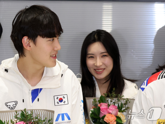 2일 인천공항으로 귀국한 쇼트트랙 국가대표팀 김길리와 임종언이 환하게 웃고 있다. 2025.12.2/뉴스1 © News1 김명섭 기자