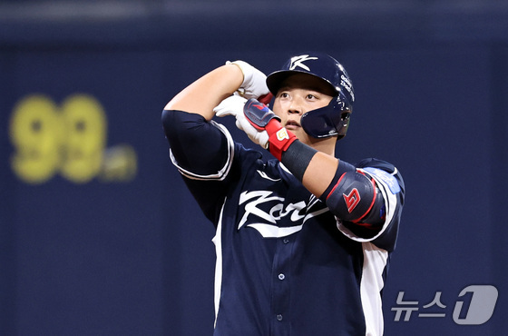 9일 오후 서울 구로구 고척스카이돔에서 열린 2026 WBC 대비 평가전 '2025 네이버 K-베이스볼 시리즈(K-BASEBALL SERIES)' 체코와의 2차전 경기. 대한민국 한동희가 9회초 2사 2루때 1타점 2루타를 친 뒤 세리머니하고 있다. 2025.11.9/뉴스1 © News1 구윤성 기자