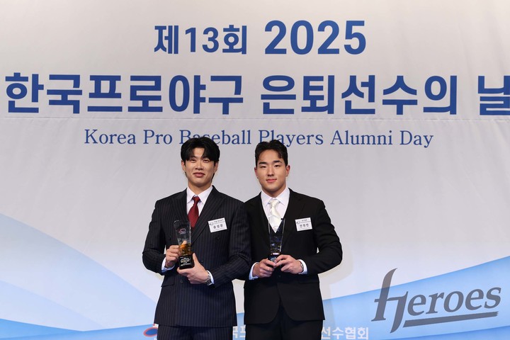 한편 신인상은 올 시즌 112경기에서 타율 0.334, 22홈런, 80타점을 남긴 kt wiz 외야수 안현민이 차지했다. 안현민은 “내년에는 송성문 선배의 자리에 설 수 있도록 노력하겠다”고 포부를 밝혔다.
