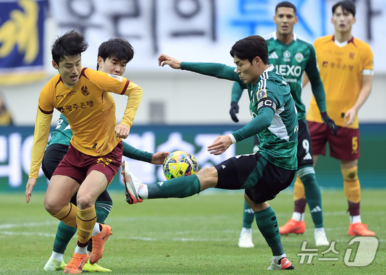6일 오후 서울 마포구 월드컵로 서울월드컵경기장에서 열린 광주FC와 전북현대의 2025 하나은행 코리아컵 결승전에서 전북 박진섭이 광주 유제호와 볼다툼을 벌이고 있다. 2025.12.6/뉴스1 © News1 박정호 기자