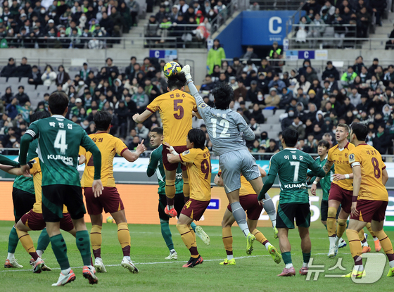 6일 오후 서울 마포구 월드컵로 서울월드컵경기장에서 열린 광주FC와 전북현대의 2025 하나은행 코리아컵 결승전에서 광주 노희동 골키퍼와 변준수가 전북 코너킥을 막고 있다. 2025.12.6/뉴스1 © News1 박정호 기자