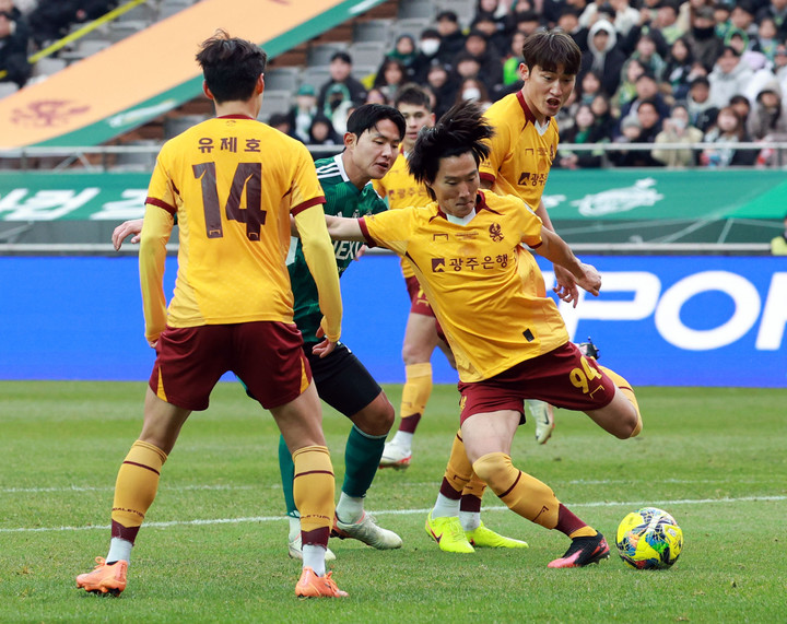 광주는 6일 서울월드컵경기장에서 열린 2025 하나은행 코리아컵 결승전에서 전북 현대와 연장 혈투를 펼친 끝에 1-2로 졌다.