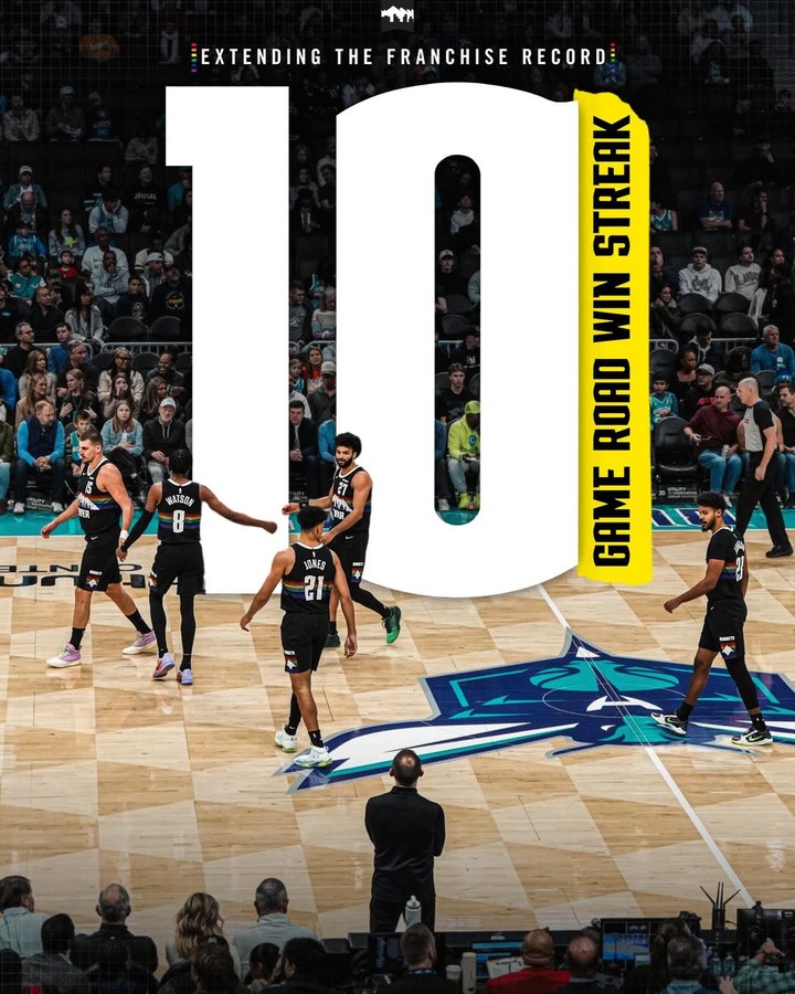 8일(한국시간) 너게츠는 샬럿 호네츠를 115-106으로 꺾고 프랜차이즈 역사상 최장인 원정 10연승을 달성했다. 이로써 덴버는 시즌 17승 6패를 기록하며 구단 사상 최고의 시즌 초반 성적도 이어갔다.