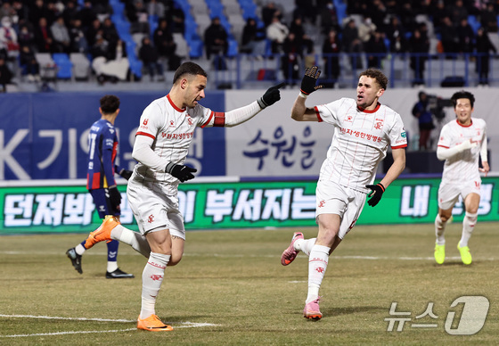 8일 오후 경기 수원시 장안구 수원종합경기장에서 열린 하나은행 K리그 승강 플레이오프(PO) 2차전 수원FC와 부천FC의 경기, 부천FC 바사니가 전반 선제골을 넣은 뒤 세리머니하고 있다. 2025.12.8/뉴스1 © News1 구윤성 기자