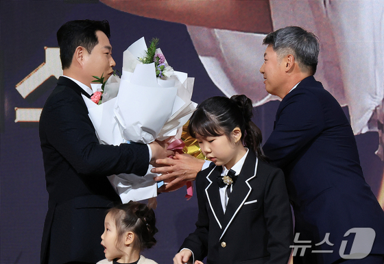 9일 오후 서울 송파구 롯데호텔 월드에서 열린 프로야구 2025 신한 SOL뱅크 골든글러브 시상식에서 포수 부문 골든글러브를 수상한 두산 양의지가 김원형 감독에게 꽃다발을 받고 있다. 2025.12.9/뉴스1 © News1 김진환 기자