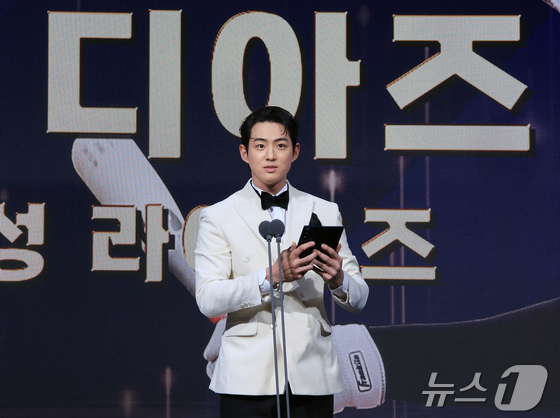 9일 오후 서울 송파구 롯데호텔 월드에서 열린 프로야구 2025 신한 SOL뱅크 골든글러브 시상식에서 1루수 부문 골든글러브를 수상한 삼성 르윈 디아즈를 대신해 주장 구자욱이 수상 소감을 말하고 있다. 2025.12.9/뉴스1 © News1 김진환 기자