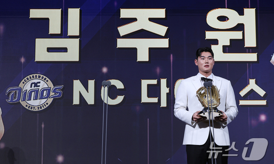 9일 오후 서울 송파구 롯데호텔 월드에서 열린 프로야구 2025 신한 SOL뱅크 골든글러브 시상식에서 유격수 부문 골든글러브를 수상한 NC 김주원이 수상 소감을 말하고 있다. 2025.12.9/뉴스1 © News1 김진환 기자
